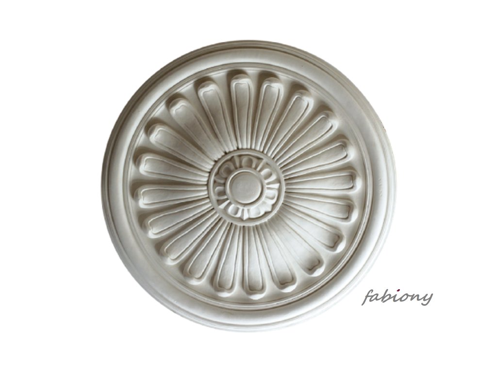 Sádrová stropní zdobná rozeta. Do sádrových rozet lze snadno vyvrtat otvor pro lustrový hák a pro kabeláž. Pro montáž použijte sádrové lepidlo. Sádrové rozety lze kombinovat se zdobnými rohy a mezi kusy a také se stropními sádrovými lištami, tak můžete vytvořit celkovou dekoraci stropu.